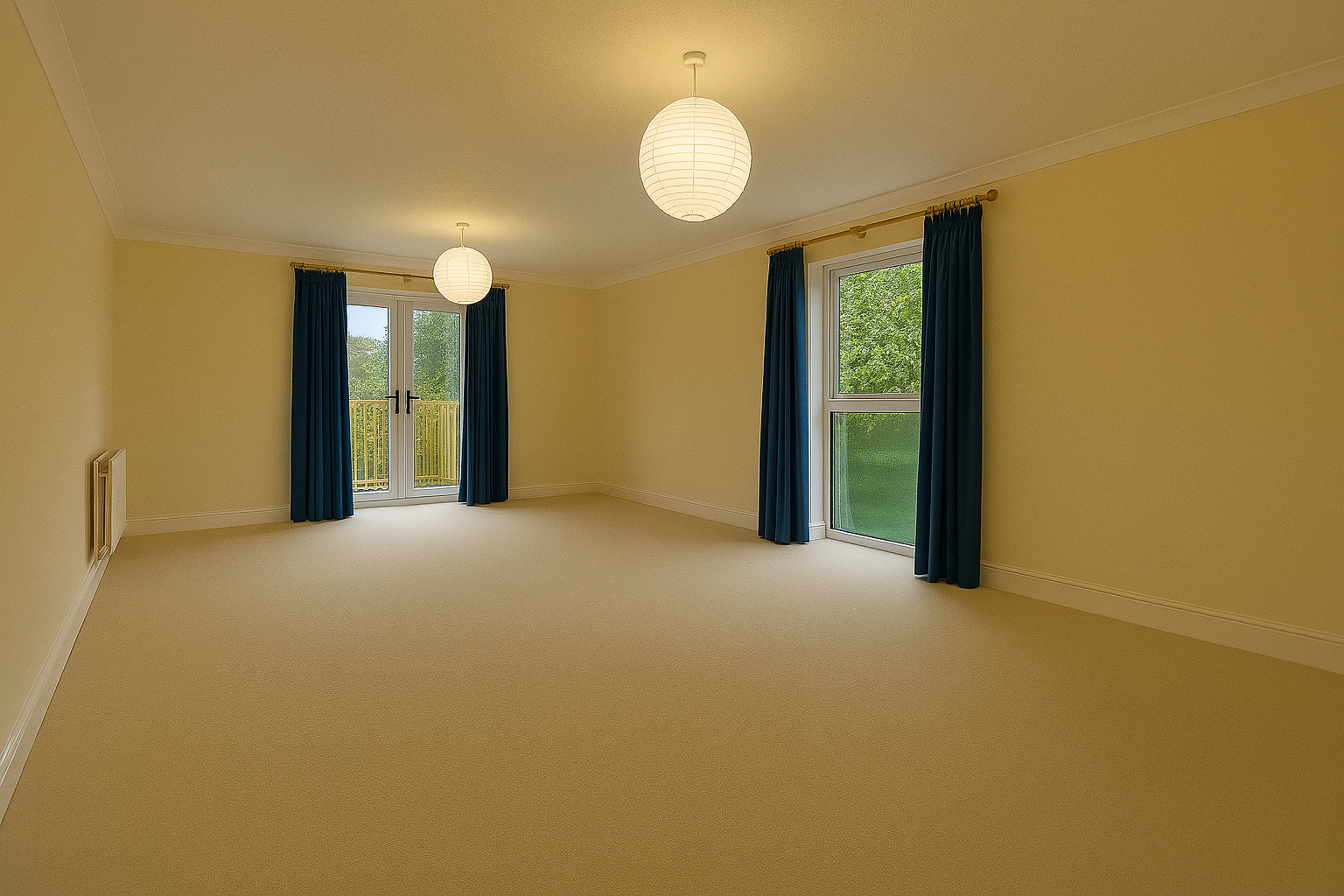 A spacious one-bedroom, one-bathroom apartment with a generous living room, filled with natural light from large windows. Both the bedroom and living room feature separate balconies, perfect for relaxing or entertaining.