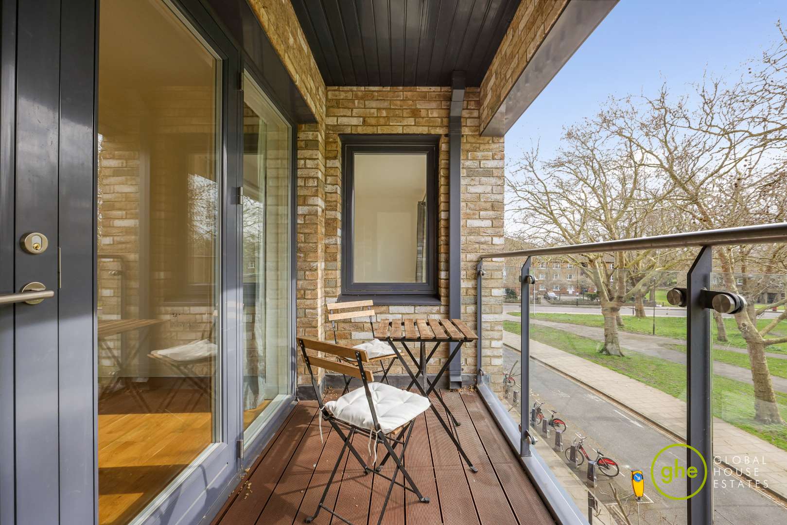 The lounge opens onto a private covered balcony, offering a peaceful outdoor space with pleasant views towards Well Street Common. The stylish kitchen is fitted with integrated appliances.